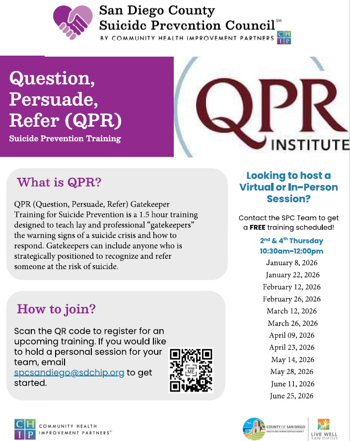 Question, Persuade, Refer (QPR) Training Mar 26 Featured 10:30 am - 12:00 pm Question, Persuade, Refer (QPR) Training Free